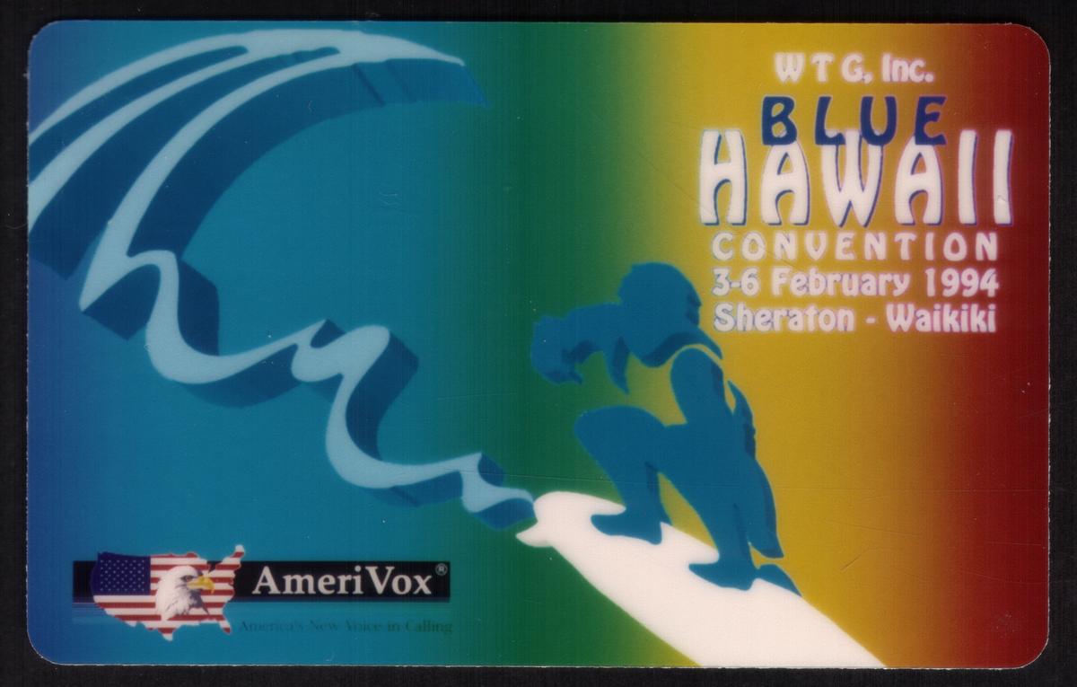 No other logos, characters, or complicated elements appear on the front. The design is clean, emphasizing the action shot of the surfer and the important event details, making this card a collectible item for those interested in surf culture, sports photography, and telecard events tied to the Blue Hawaii Convention.