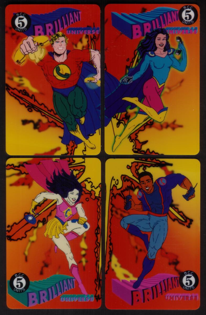The fourth card shows a male superhero with dark hair dressed in a blue costume with red trim and accents. He holds two black telephone handsets, one in each hand, and his cape appears dark purple or blue. Each card has the "BRILLIANT UNIVERSE" logo with bold, colorful lettering integrated into the colorful background design.