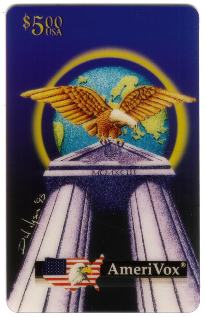 At the bottom, there is a small graphic of the United States flag overlaid with a bald eagle head, next to the branded text "AmeriVox®." This phone card is clearly connected to the AmeriVox series titled “Nyson II Eagle On Top of Roman Temple Columns,” reflecting its artistic and Americana themes while emphasizing the presence of the American bald eagle and symbolic architectural motifs.