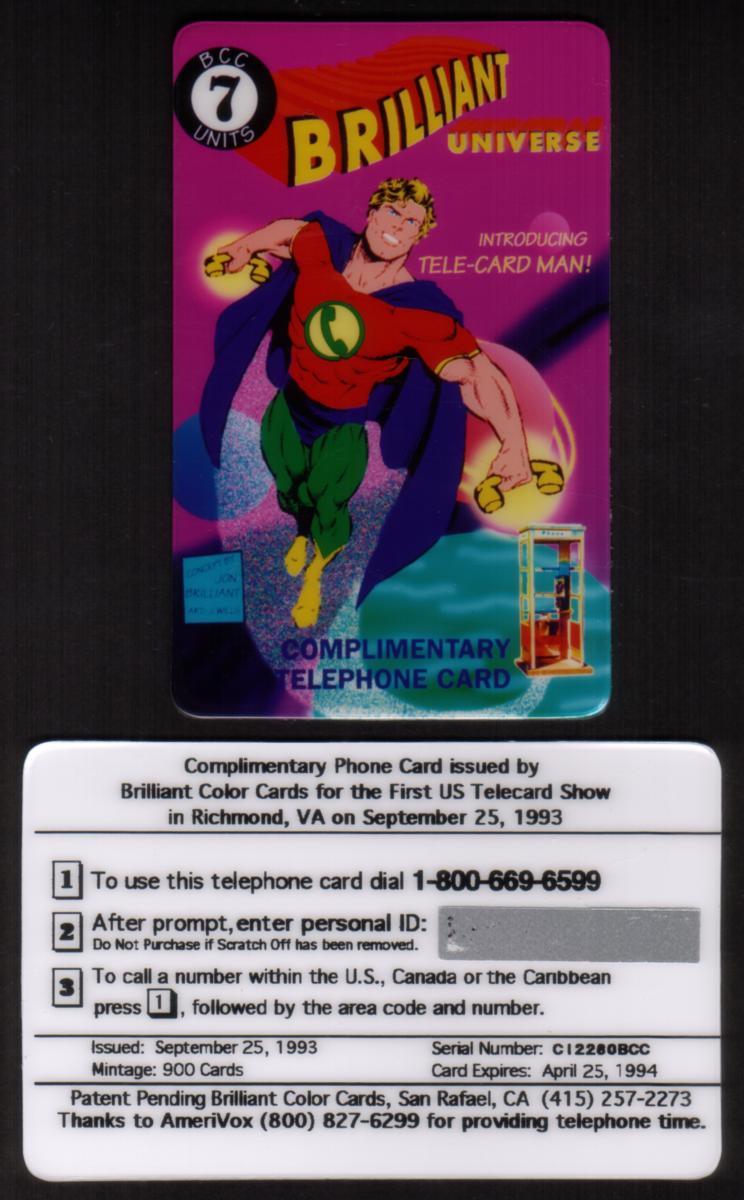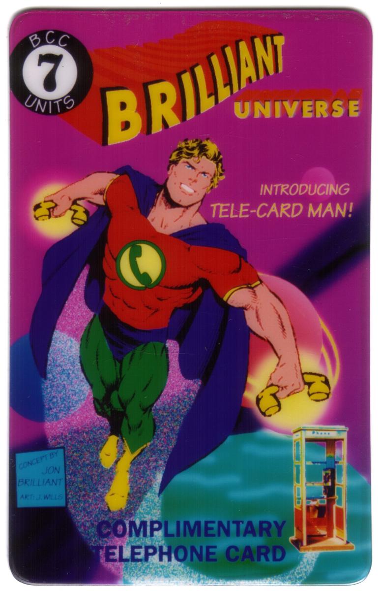 The background is predominantly magenta with dynamic, radiant bursts of blue, purple, and yellow that give the image a vibrant and energetic look. Bold yellow text at the top reads "BRILLIANT UNIVERSE" with "7 BCC Units" shown inside a black circle in the upper left corner. Below the superhero, "INTRODUCING TELE-CARD MAN!" is printed in yellow uppercase letters. Near the bottom right, there is a small graphic of a vintage telephone booth, rendered in yellow and white.