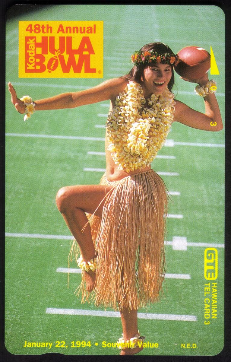 The card is branded with the "Kodak 48th Annual Hula Bowl" logo in bold yellow and red text in the top left corner. Additional information printed on the card includes the date "January 22, 1994" and the phrase "Souvenir Value" in yellow text at the bottom. The right side of the card includes "GTE Hawaiian Tel Card 3" printed vertically in yellow with a red GTE logo above it.