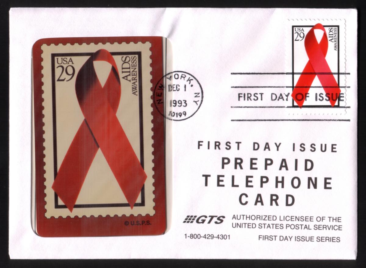 This prepaid telephone card and First Day Cover collectively commemorate the release of the HIV/AIDS awareness campaign stamp by the United States Postal Service in 1993. The red ribbon serves as an international symbol of solidarity and activism for people affected by the disease. The card and cover are collectible items that highlight fundraising and activism related to health and disease awareness, specifically emphasizing AIDS awareness through philatelic memorabilia.