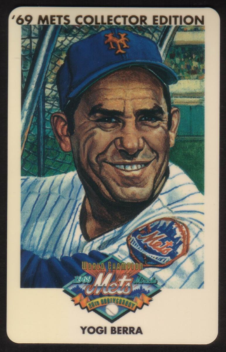 Players and figures depicted include Ed Yost, Tommie Agee, Yogi Berra, Ken Boswell, Don Cardwell, Ed Charles, Donn Clendenon, Jack DiLauro, Duffy Dyer, Wayne Garrett, Rod Gaspar, Gary Gentry, Jerry Grote, Bud Harrelson, Gil Hodges, Cleon Jones, Cal Koonce, Jerry Koosman, Ed Kranepool, J.C. Martin, Jim McAndrew, Tug McGraw, Bobby Pfeil, Joe Pignatano, Nolan Ryan, Tom Seaver, Art Shamsky, Ron Swoboda, Ron Taylor, Rube Walker, and Al Weis. Each portrait shows the player in Mets uniform with the team cap displaying the prominent orange "NY" logo. Most of the portraits show the players against baseball-related backgrounds such as the field, stadium seats, dugout, scoreboard, or crowd.