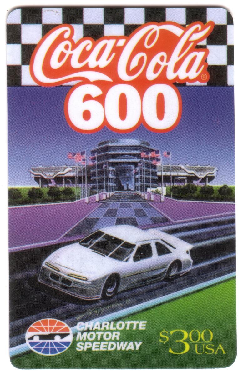 This collectible phone card features imagery connected to the Charlotte Motor Speedway in Charlotte, North Carolina, highlighting the Coca-Cola 600 event held in May 1994. The primary focus is on auto racing, with a strong emphasis on automobiles and motorsports. The card bears multiple Coca-Cola logos, reinforcing the sponsorship link to the Coca-Cola 600 race.