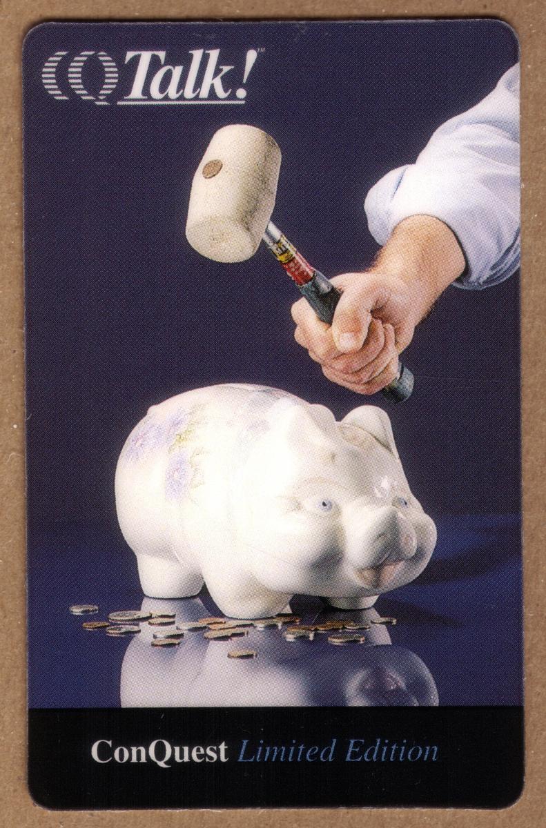 No other logos or images are present on the front of the card beyond those described. The card’s design visually emphasizes the idea of breaking open a piggy bank, linking the physical act to the conceptual theme of currency and savings. The inclusion of “ConQuest Telecommun.” identifies the issuer or brand associated with this collectible card.