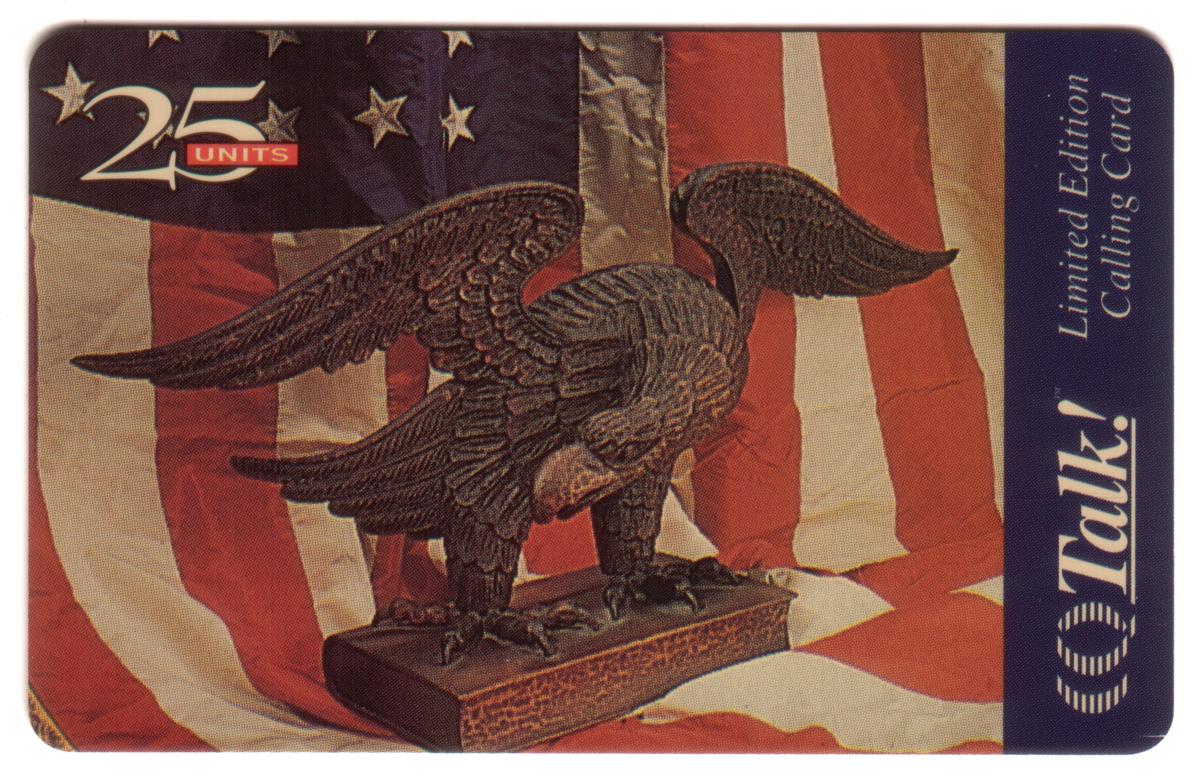 This collectible phone card features a vivid depiction of an American bald eagle in mid-flight. The eagle dominates the center and right side of the card, portrayed with its wings fully extended and talons outstretched. The fine detail of the feathers and the strong, focused expression on the eagle’s face capture the power and majesty of this iconic bird. Its plumage is primarily white on the head and tail, with dark brown feathers covering the rest of its body, consistent with the species.