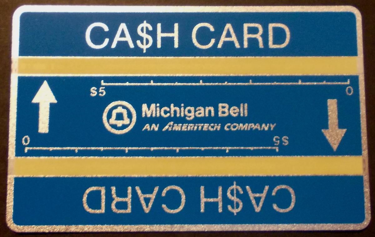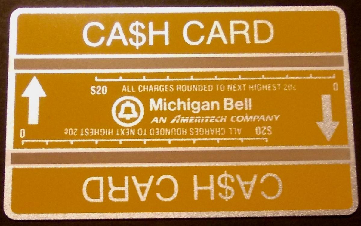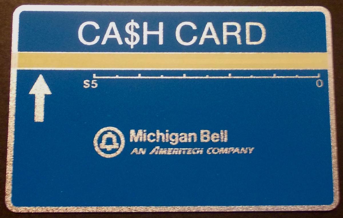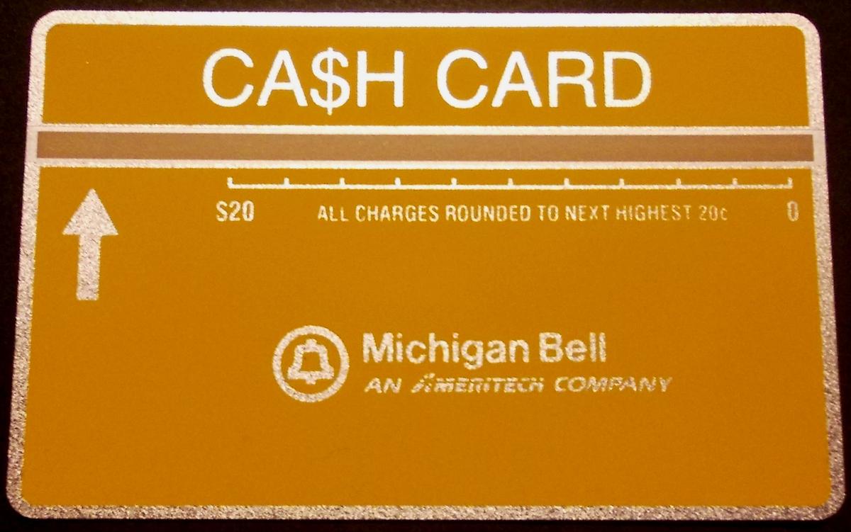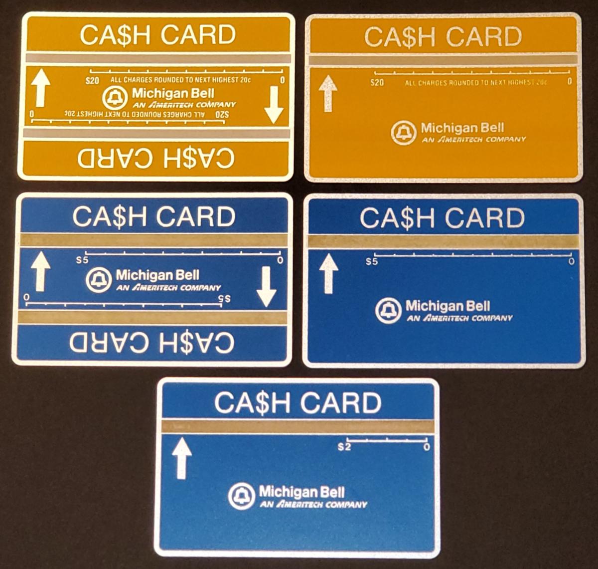 Set of Michigan Bell CA$H CARDs with optical stripes, varying values, bold branding, and rounded charge info, showcasing historic prepaid phone technology. |