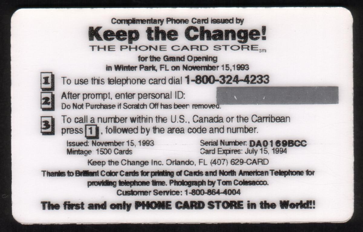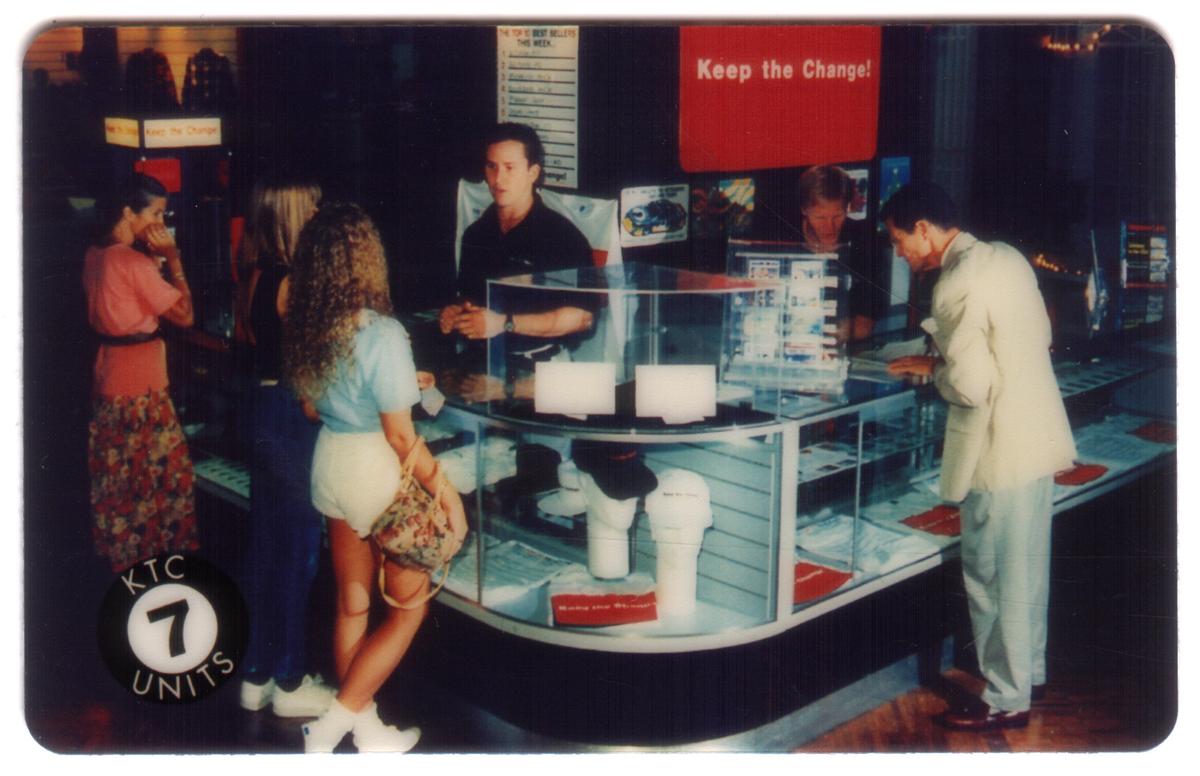The store interior features product showcases containing various items under glass, likely phone cards or related memorabilia. Prominent above the counter is a red sign reading "Keep the Change!" which emphasizes the promotional theme of the event. The card displays "KTC 7 UNITS" on the lower left corner, indicating the phone card’s unit value.