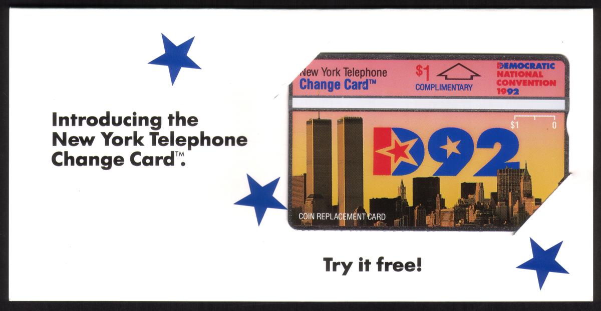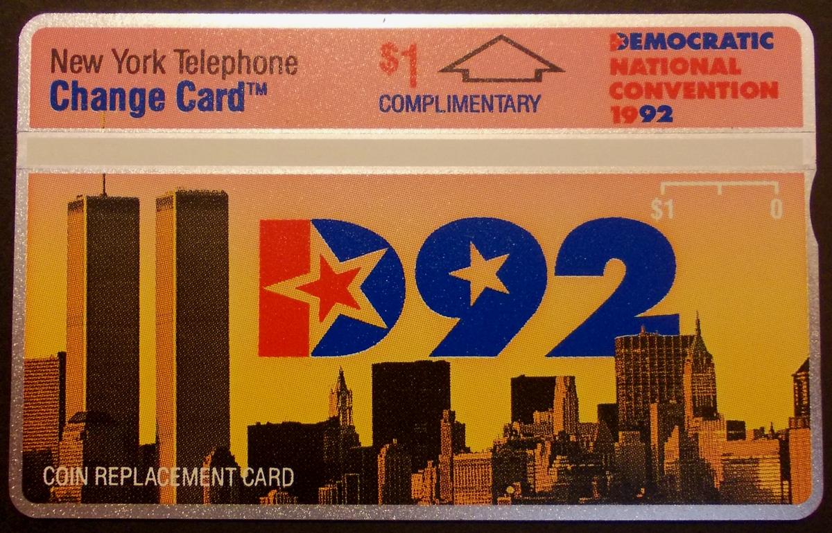 Collectible 1992 New York Telephone Change Card featuring NYC skyline, Twin Towers, D92 patriotic design, and Democratic National Convention branding. |