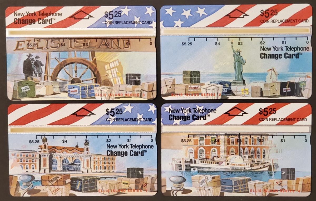 These four collectible New York Telephone Change Cards are part of the Ellis Island Series, each with a $5.25 value marked as "COIN REPLACEMENT CARD." Each card features a stylized illustration related to Ellis Island and iconic American landmarks connected to immigration history and New York City's waterways.