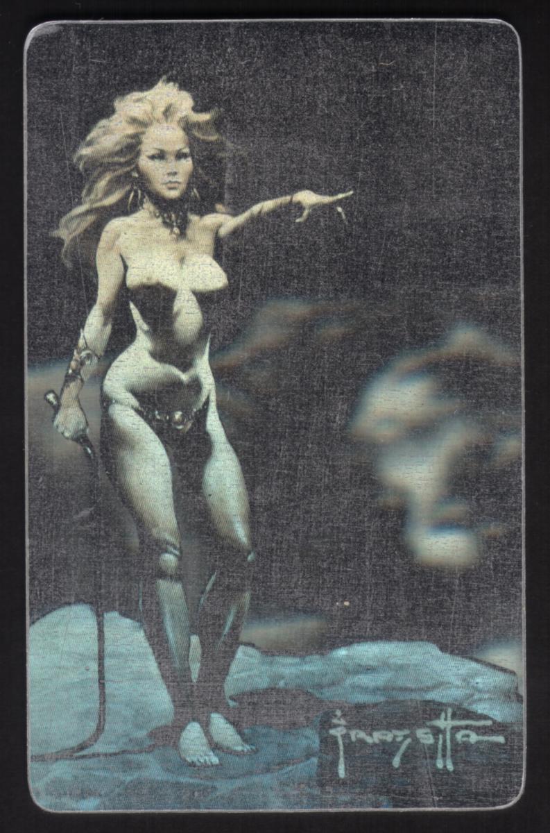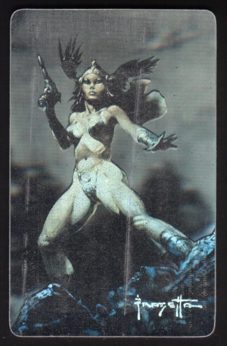 This set of three collectible phone cards features artwork by Frank Frazetta, showcasing female figures with a fantasy and mythical theme. Each card depicts a unique woman with wings, rendered in Frazetta’s signature detailed and dynamic style. The first card shows a strong, armored woman standing on rocky terrain, wielding a weapon in her right hand and wearing a helmet with wing-like extensions. Her stance is powerful and commanding.