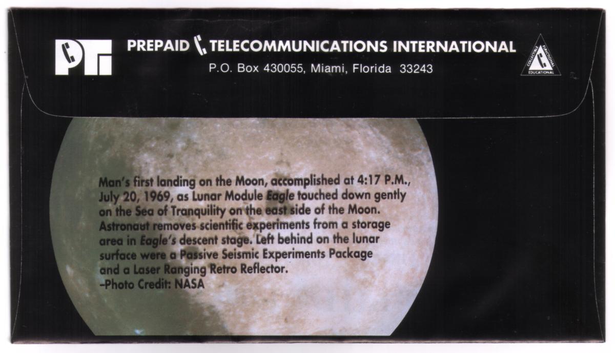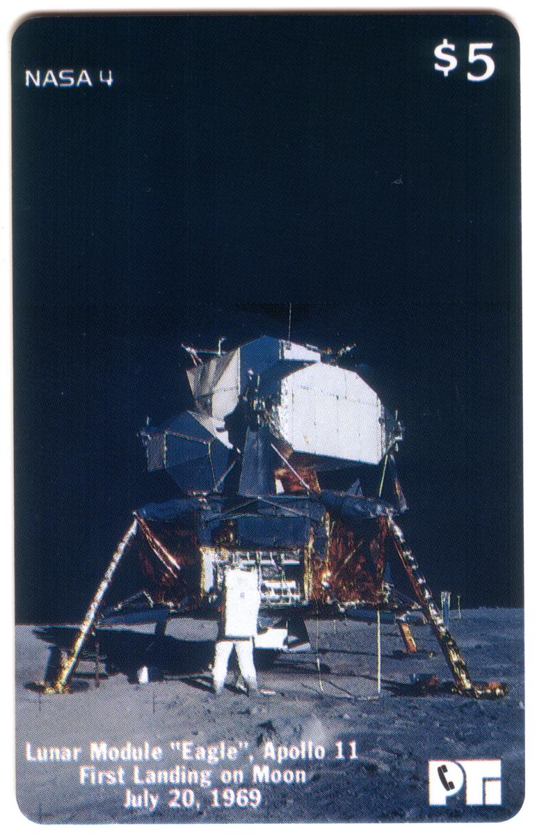 This collectible phone card relates to space exploration and commemorates NASA’s Apollo 11 mission, highlighting the first crewed lunar landing using the Lunar Module "Eagle." It emphasizes NASA photographs and aeronautics, featuring key space exploration themes tied to the Kennedy Space Center and the Earth-Moon missions.