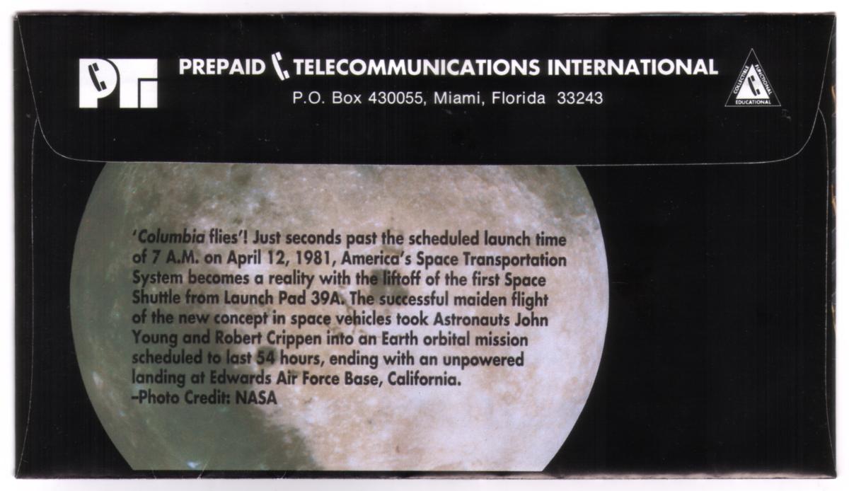 Keywords: Space exploration, outer space, space crafts, space shuttles, NASA photographs, Kennedy Space Center, KSC, aeronautics, First Space Shuttle Launch, Space Shuttle Launches, mint in envelope, Prepaid Telecom. Intl