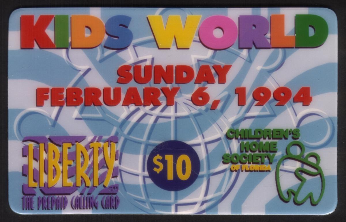 This collectible phone card features imagery associated with the Children's Home Society of Florida. The card prominently includes the text "Kids World 1994 (Children’s Home Society of Florida)" along with "Quest Group Internatl," identifying the group involved with this fundraising or charitable effort. The face value marked on the card is $10.