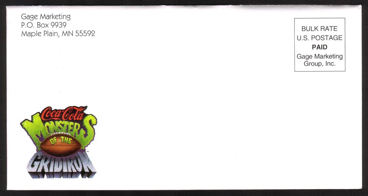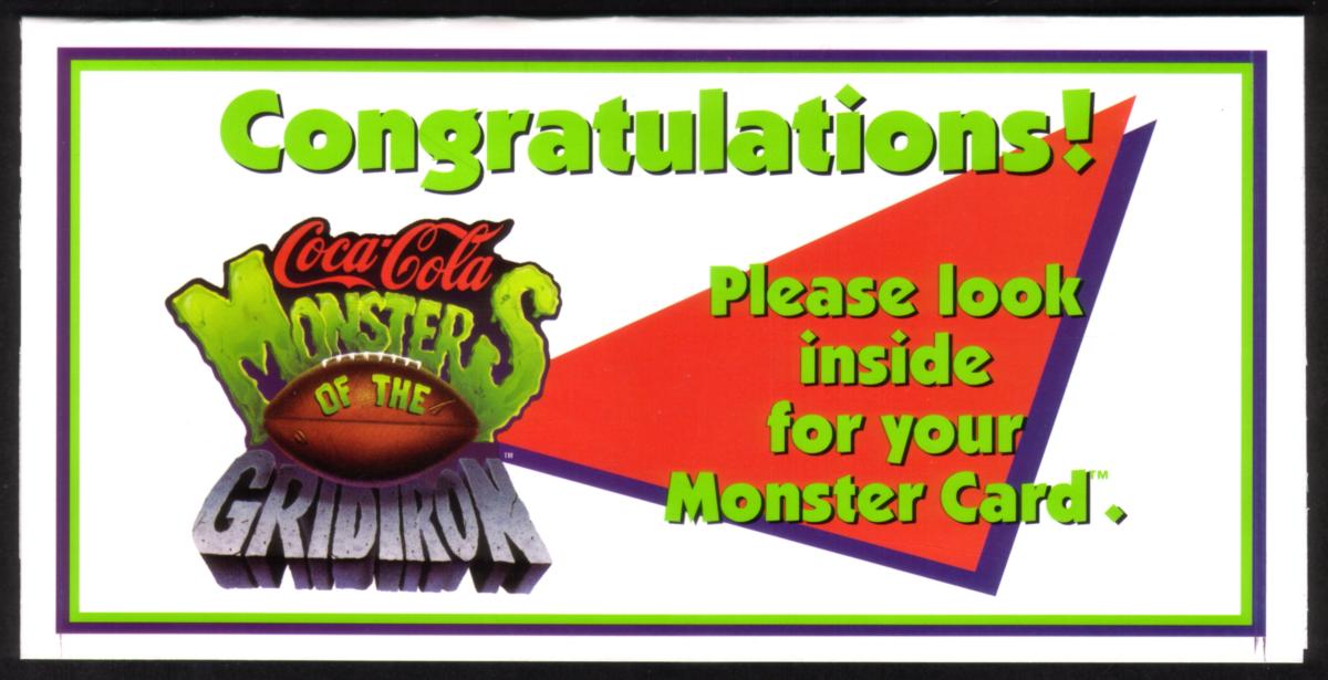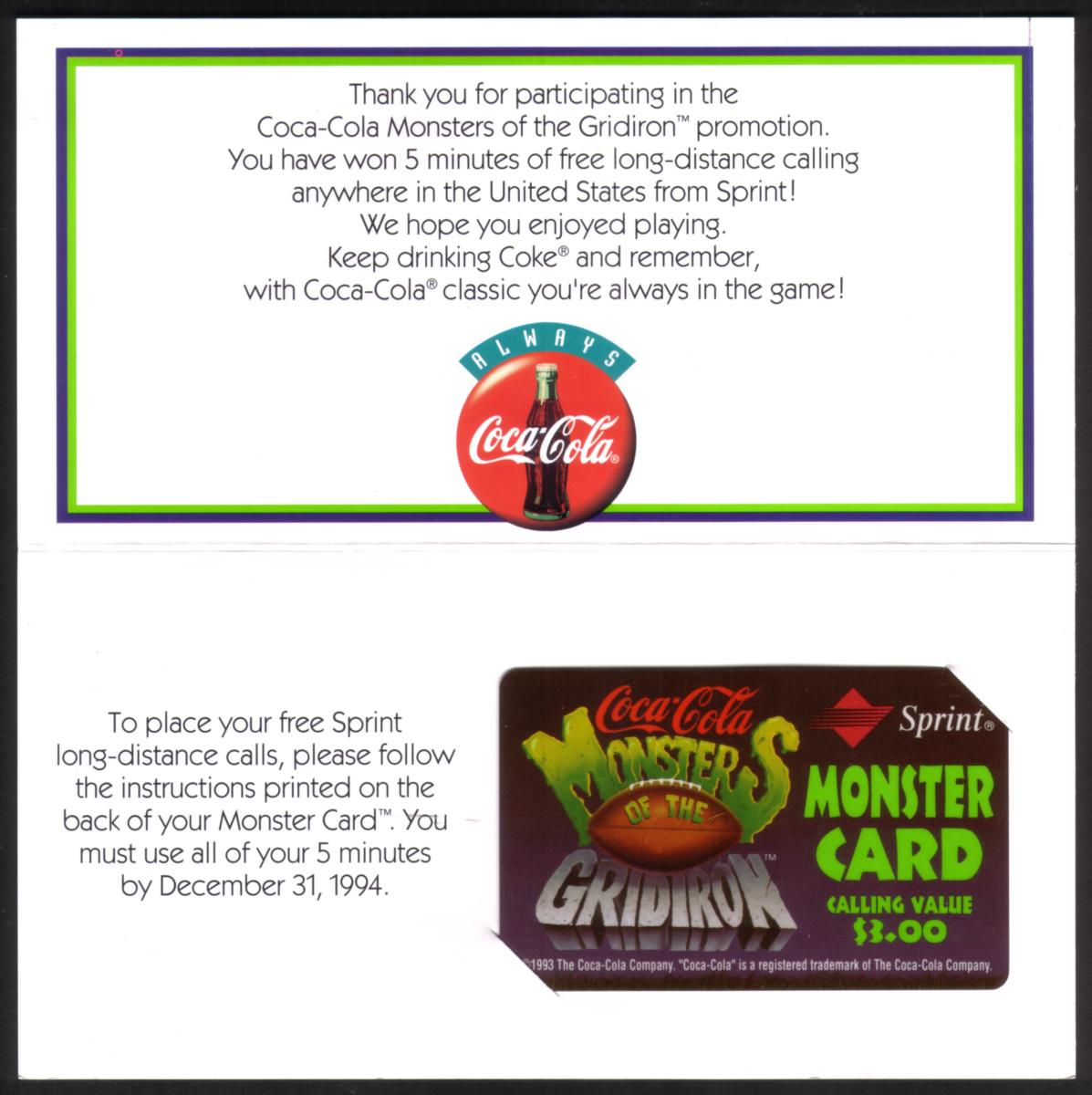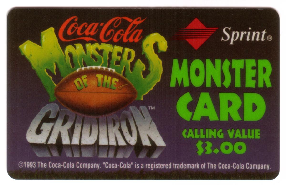 This collectible phone card features the "Coca-Cola Monsters of the Gridiron" design from 1993. The card prominently displays the Coca-Cola logo in red at the top left, with the word "Monsters" stylized in a large, green, organic-looking font arching over a football graphic. Below the football, the words "of the Gridiron" appear in bold, metallic grey text.