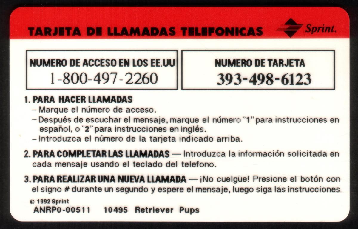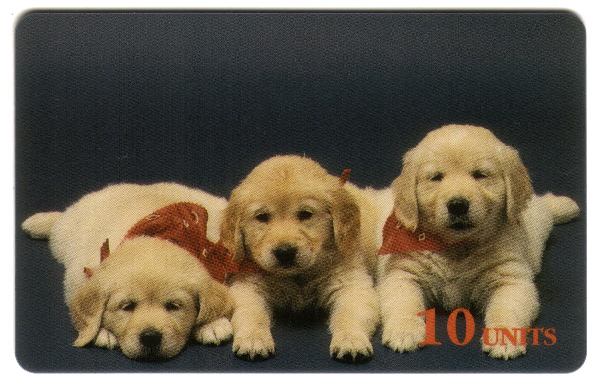 Collectible phone card featuring three golden retriever puppies with red bandanas, set against a dark background, with denomination and functional details. |