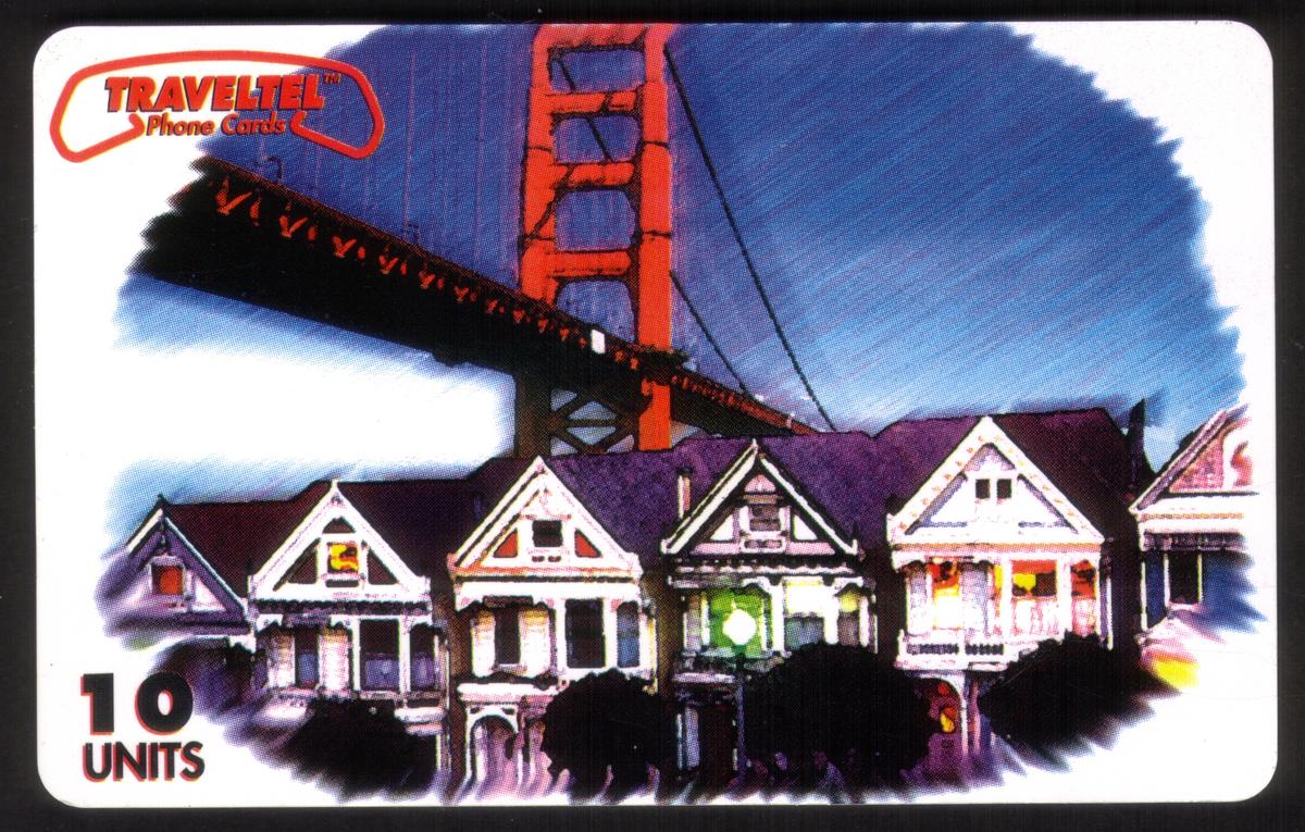 Printed text on the card includes “San Francisco CA” and “TravelTel Phone Cards,” confirming the card’s association with the city and identifying it as a phone card issued by TravelTel. The denomination “10u” is displayed, referring to its usage value. Additional wording includes “Artistic View With Homes & Golden Gate Bridge,” which matches the visual content and affirms the subject matter.