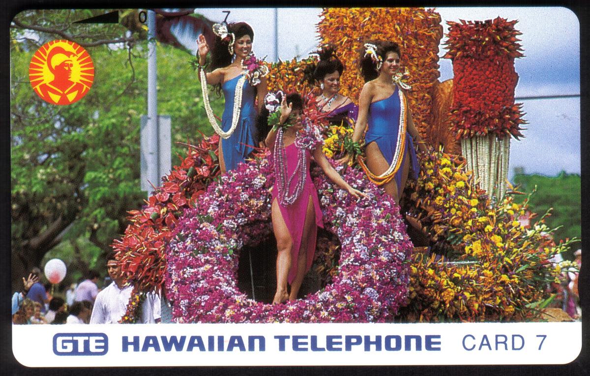 The phone card includes text elements that identify the event and the sponsoring entity clearly: “Hawaiian 7u Aloha Festival Week Parade 1991” and “GTE Hawaiian Telephone.” These words confirm the origin and purpose behind the imagery, associating it directly with the phone company’s promotional presence during the festival week.