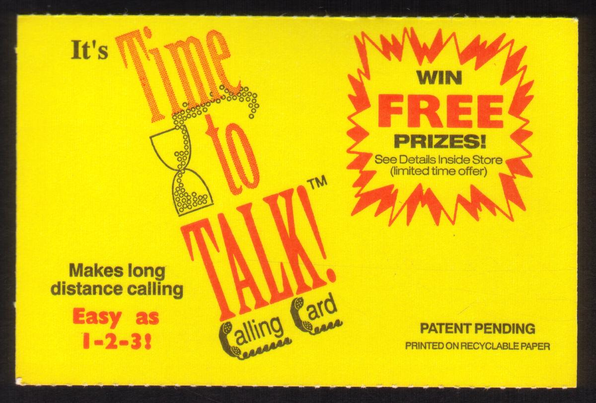This collectible phone card features a bright yellow background with bold red and black text. The main slogan in large red letters reads "Time to TALK!" with an hourglass graphic composed of dots to the left of the text, reinforcing the theme of time. Above the slogan, smaller black text states "It's," completing the phrase "It's Time to TALK!" The word "TALK!" is accompanied by the trademark symbol (™).
