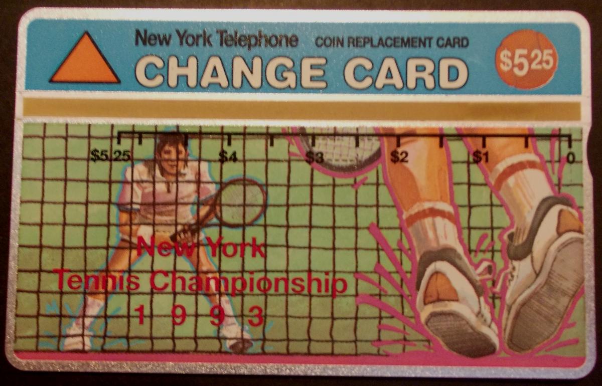 No other names or additional graphic elements are present beyond those mentioned. The phone card is a tangible collectible piece commemorating the 1993 U.S. Open tennis tournament, combining sport-related imagery with telecommunications branding from New York in the early 1990s.