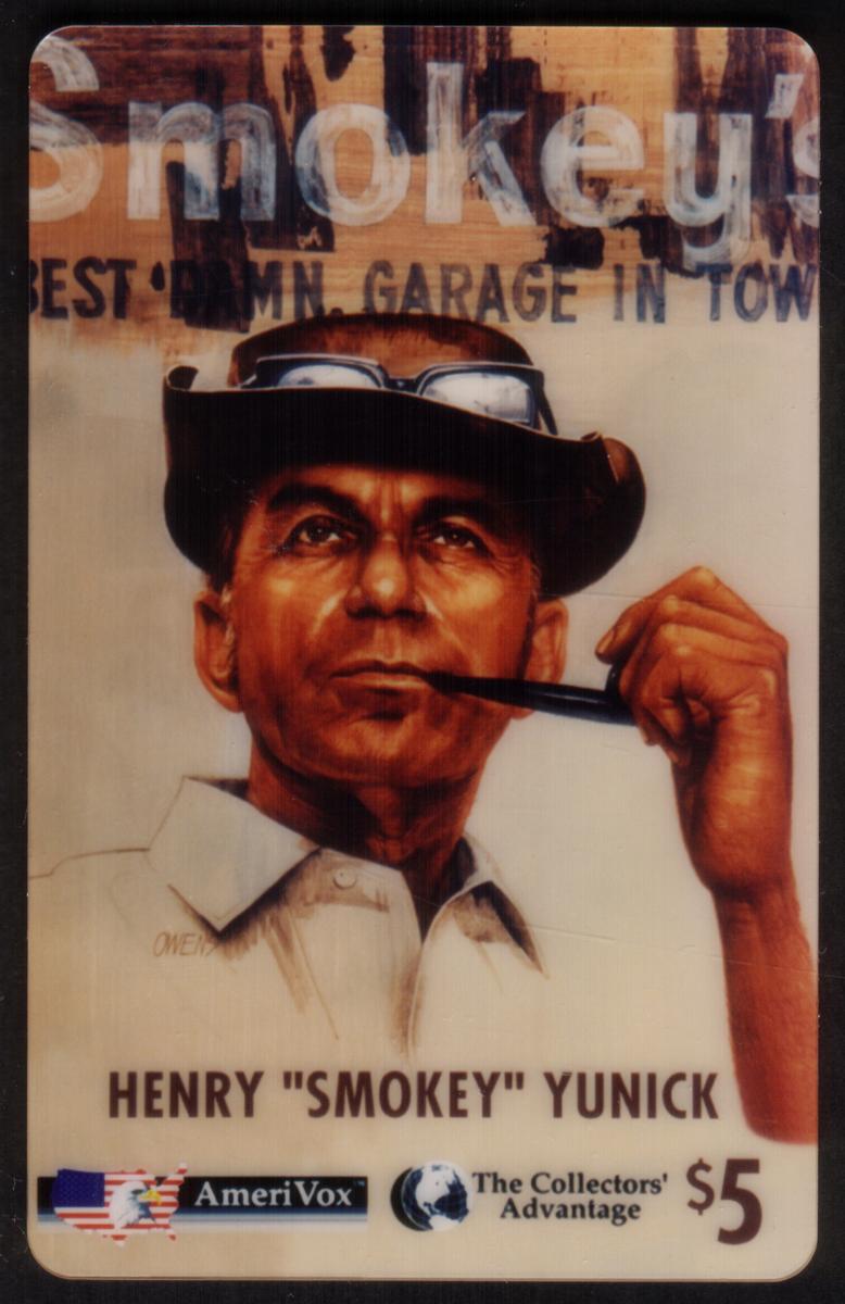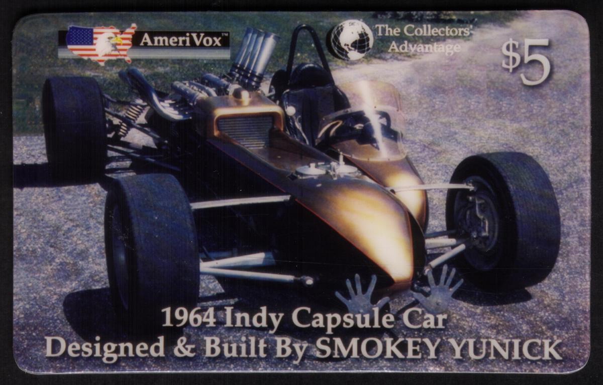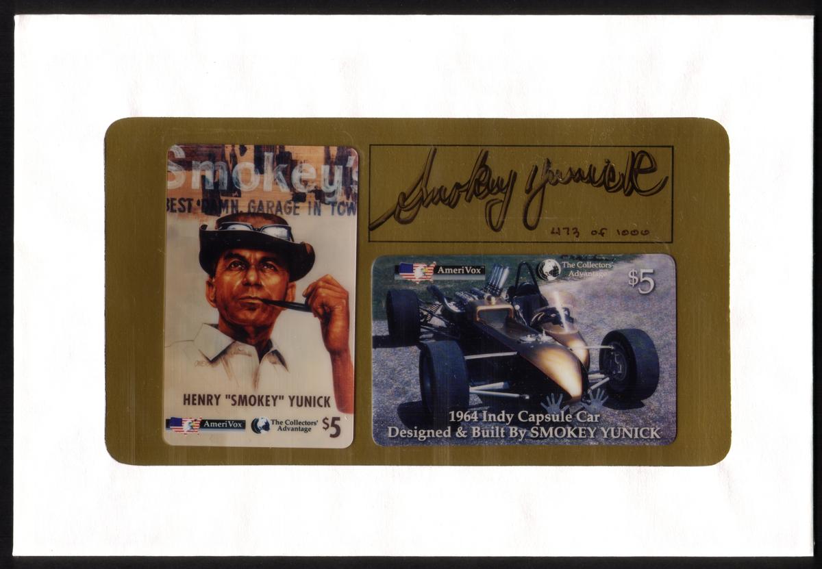 Both cards include the AmeriVox logo and branding, emphasizing their official collectible status. The text on the cards clearly identifies Henry "Smokey" Yunick’s name along with the 1964 Indy Capsule Car, underlining their connection to American auto racing heritage. The combination of the signed cards and these visuals makes this set a significant tribute to Yunick’s engineering legacy and the historic Indianapolis Motor Speedway.