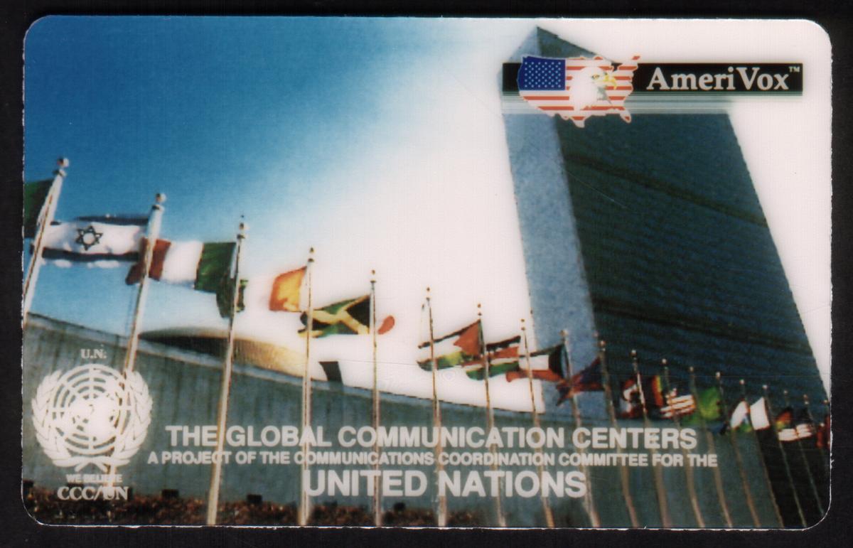 This collectible phone card, issued by AmeriVox, features a color photograph of the United Nations headquarters building in New York City. The image shows the iconic tall Secretariat Building prominently on the right side. In the foreground, a series of international flags on flagpoles stand in a row, representing member countries of the United Nations. The flags are positioned against a clear sky with sunlight illuminating them.