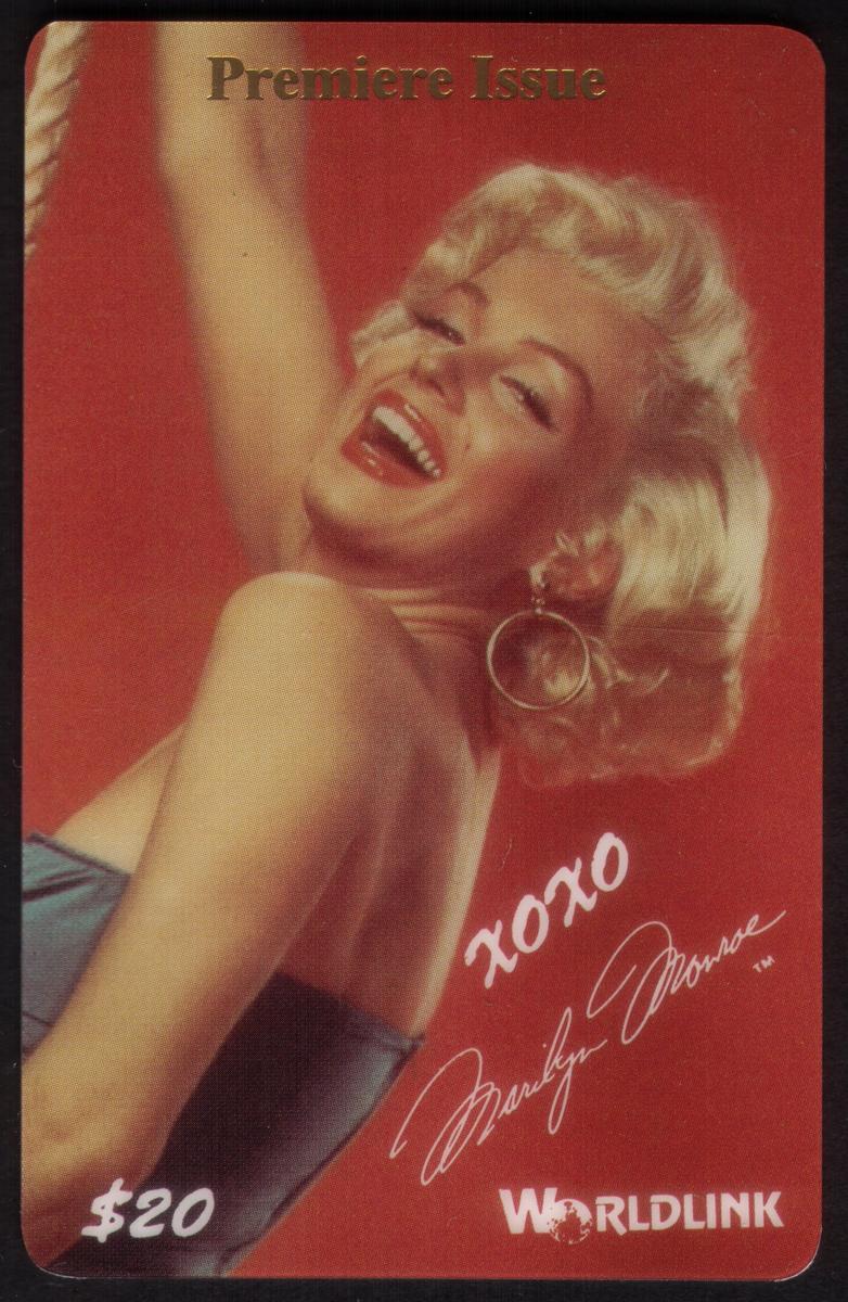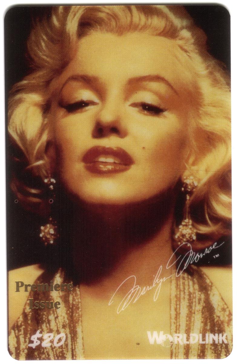 These collectible phone cards from WorldLink Communications each feature iconic photographic images of Marilyn Monroe. The set includes three distinct $20 Premiere Issue cards, showcasing different classic portraits of the legendary Hollywood actress. Each card prominently displays Marilyn Monroe’s signature in white script, emphasizing her celebrity status.