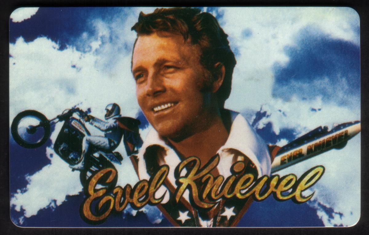 Overall, this phone card celebrates Evel Knievel’s legacy as a daredevil, combining close-up portraiture and dynamic action photography. The design is straightforward and focused, showcasing both the man and the thrill of his motorcycle stunts without additional distractions or graphics.
