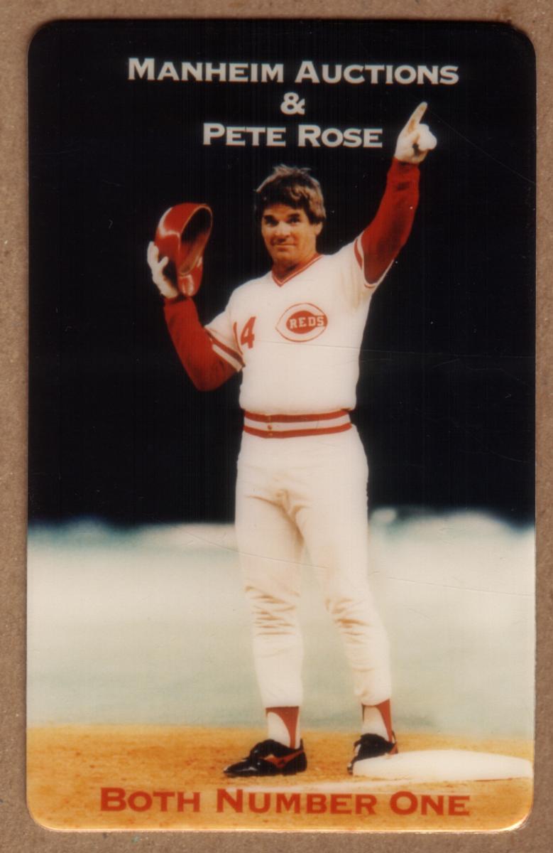 This card is part of a sports-themed collectible series linked to baseball, featuring notable personalities and memorabilia associated with Manheim Auctions in California. The image and text together highlight Pete Rose’s legacy and the auction branding, making it a distinctive item for collectors interested in baseball, famous athletes, and celebrity sports memorabilia.