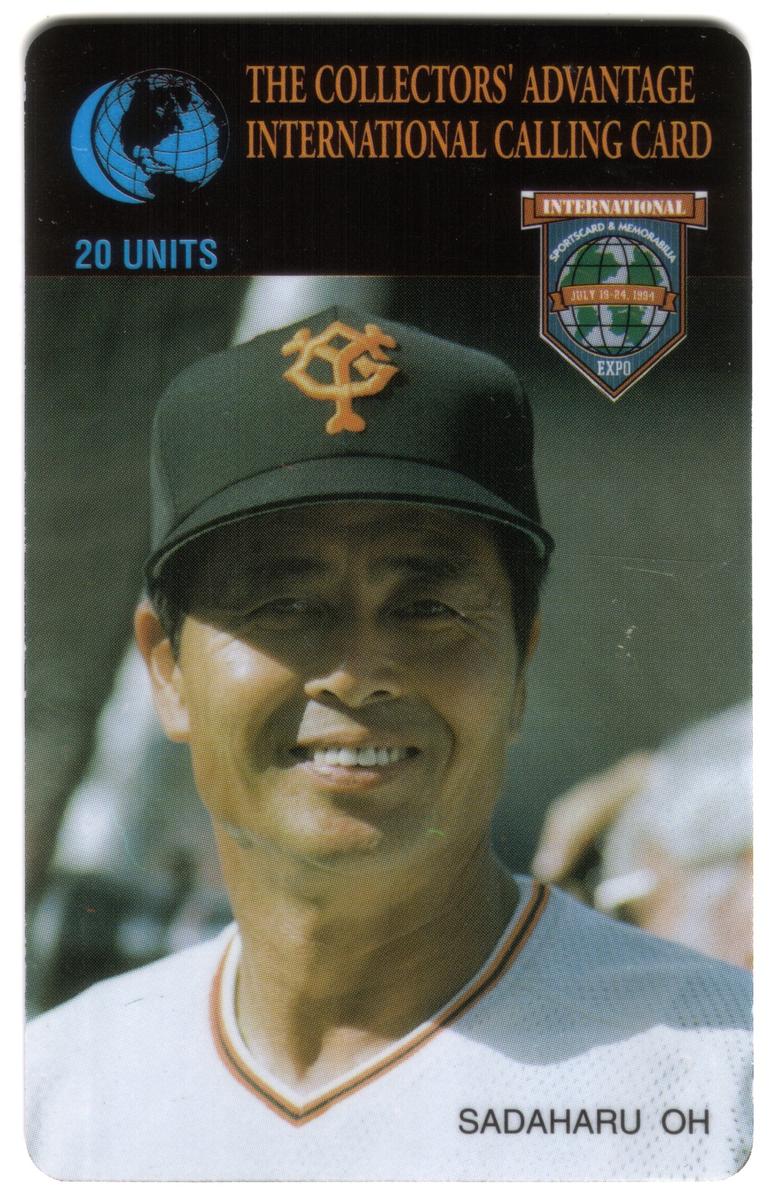 The collectible card features a clear photographic image of Sadaharu Oh, the renowned Japanese baseball star. He is shown smiling, wearing a black baseball cap with the distinctive orange emblem of the Yomiuri Giants, a professional baseball team in Japan. He is dressed in a white baseball jersey with an orange trim visible around the neck.