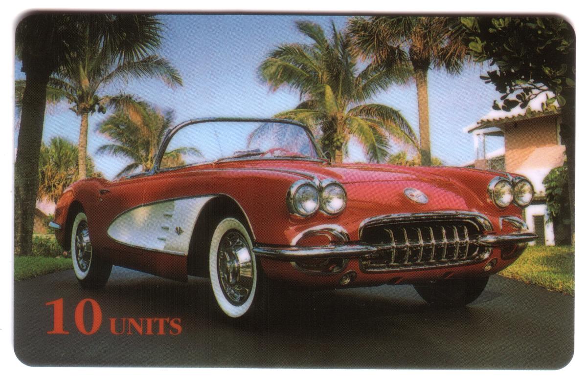 This phone card was issued in 1992, as part of a classic cars collectible series. The image captures the timeless appeal of the Corvette in a lush, tropical environment, showcasing its status as an automotive classic.