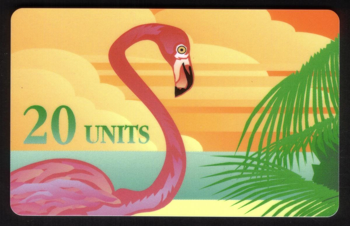 The flamingo is prominently positioned on the left side of the card, depicted in a minimalistic, watercolor-inspired style with shades of pink and darker accents on its beak and feathers. Above the bird, the value "20 UNITS" is clearly printed in green text, indicating the card's usage amount.