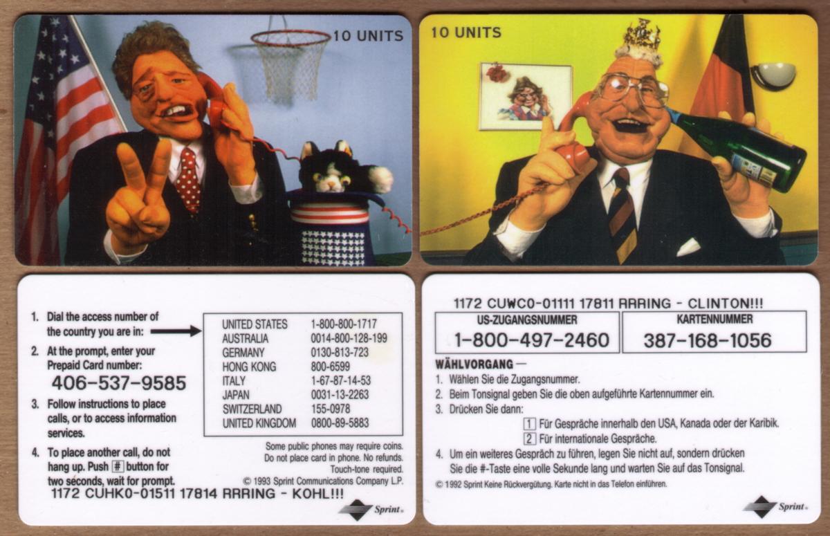 These cards represent political satire focused on US and German presidents and emphasize liberal progressive commentary using cartoon-strip style art. The set’s presentation, with the two leaders posed with telephones and humorous expressions, highlights aspects of political communication and caricature in a collectible format with a Sprint connection.