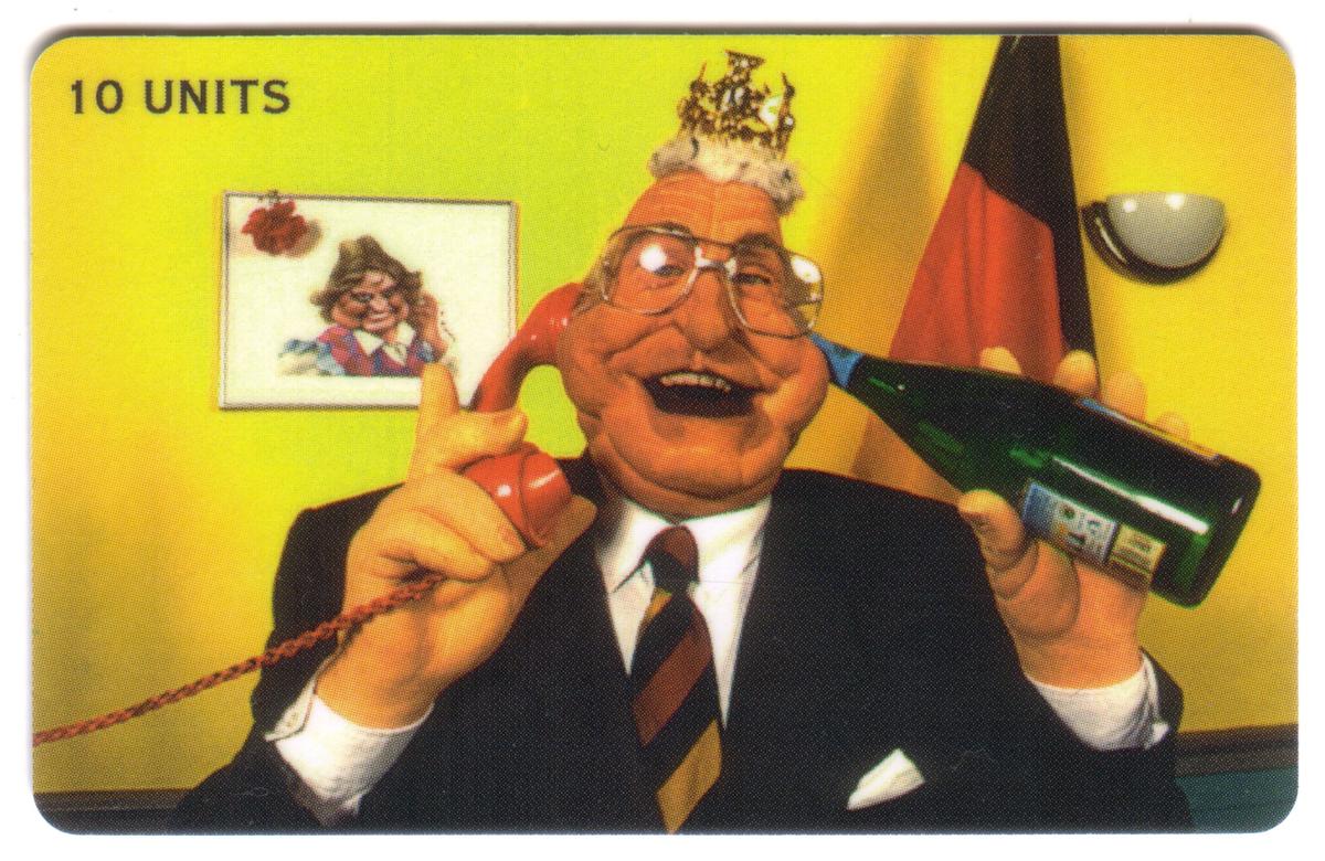 The second card portrays Helmut Kohl, identified by his German flag in the background and distinguished glasses. He wears a dark suit, white shirt, and a diagonally striped tie in black and gold. Kohl is holding a red telephone receiver in his left hand and drinking from a green bottle with his right. On his head is a small crown made of a crumpled paper-like material. Behind him on the yellow wall is a framed picture of another cartooned person on the phone, enhancing the humorous political theme.