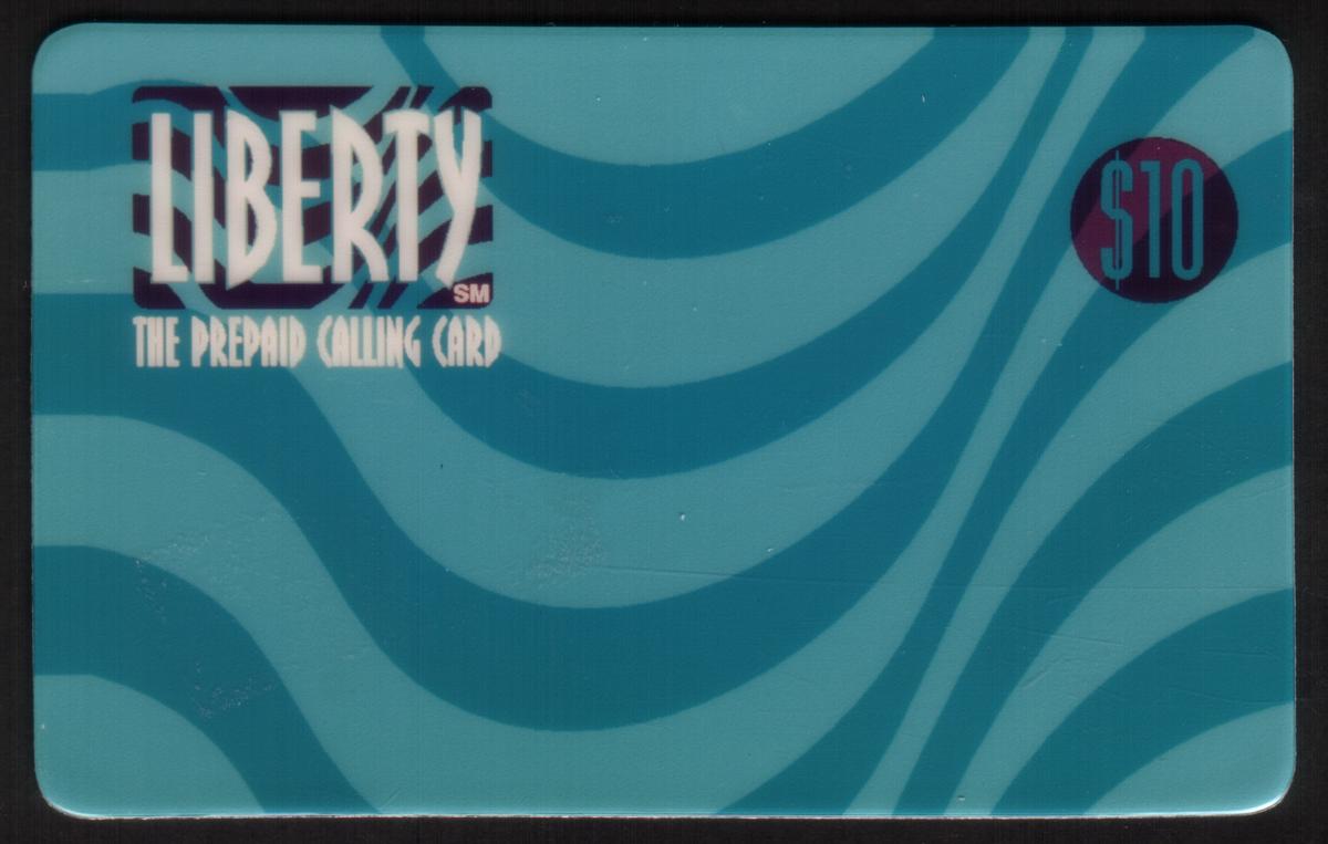 This collectible phone card features a light blue background with flowing wave designs that cover the entire surface, creating a serene aquatic theme. The card prominently displays the word "Liberty" in stylized text, aligning with the overall theme suggested by the waves. The design evokes a sense of calmness and fluidity, with soft blue hues blending into each other smoothly.