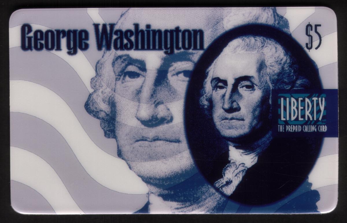 The card’s design includes stylized, wavy stripes reminiscent of the American flag in the background, creating a patriotic theme. In the upper right corner, the denomination "$5" is displayed. Below this, the text "LIBERTY THE PREPAID CALLING CARD" is printed in capital letters, indicating that this card is a prepaid calling card issued by Liberty. The overall color palette is monochromatic, with blue tones emphasizing the historical and Americana theme.