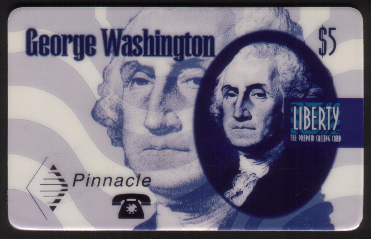 Overall, the card combines a strong Americana motif with an image of George Washington, presenting a collectible phone card that highlights significant elements of U.S. financial and political heritage, specifically linking the image to Pinnacle Bank and the issuer Quest Group Internatl.