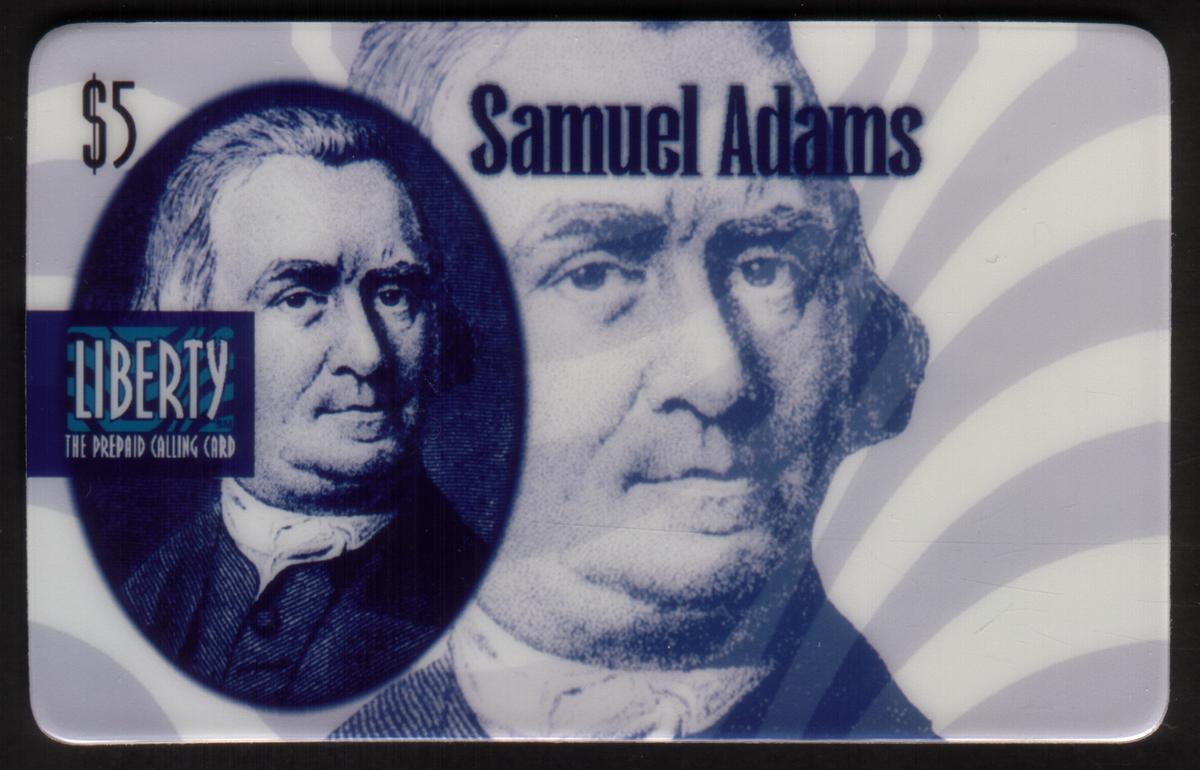 The card is part of a series recognizing famous people from American history, specifically focusing on Revolutionary War leaders and politicians. The connection to Americana is underscored by the emphasis on Samuel Adams, who is well-known for his contributions to the founding of the United States. There is a clear designation showing a $5 value on the card, which identifies it as a collectible phone card rather than currency or another type of card.