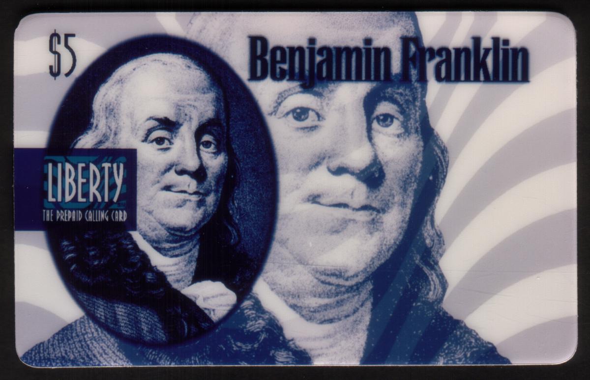 The card's denomination is $5, shown in the upper left corner. Below the small oval portrait is a blue rectangular logo with the word "LIBERTY" in uppercase letters, and beneath it, the phrase "THE PREPAID CALLING CARD." At the top right, the name "Benjamin Franklin" is printed in bold, black uppercase letters, clearly identifying the historical figure.