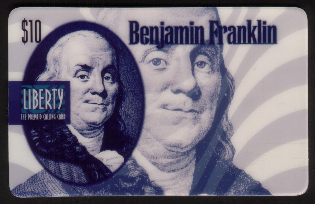 Benjamin Franklin design with blue portrait, layered imagery, radiating background, and modern Liberty logo, $10 denomination, commemorative prepaid phone card |