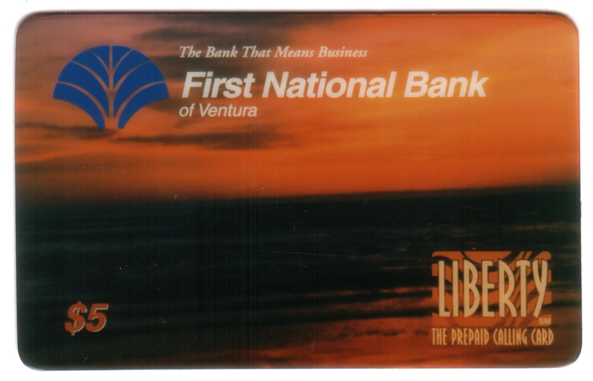 This collectible promotional calling card features branding from First National Bank of Ventura with the slogan "The Bank That Means Business" displayed prominently in white text at the top center. The bank's logo, a stylized blue tree with multiple branches, is positioned to the left of the bank name. The background image shows a deep orange and dark gradient suggesting a sunset or sunrise over a vast landscape, emphasizing a warm and professional tone.