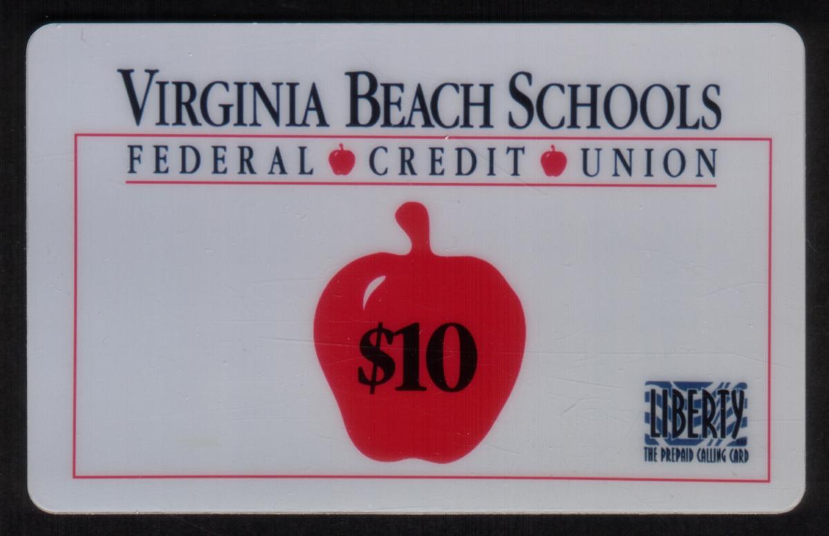 This card is associated with financial institutions, specifically a federal credit union serving the Virginia Beach Schools community, and it functions as a prepaid calling card for telecommunication use.