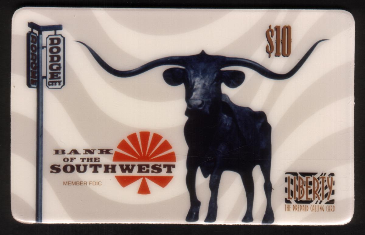 This collectible bank card features imagery associated with the Bank of the Southwest located in Dodge City. The main focus of the card’s front is a detailed depiction of a Longhorn steer. The steer is prominently displayed in the center, symbolizing the bank’s connection with the American Southwest and cattle industry. The image highlights the long, curved horns characteristic of this breed, reinforcing themes of wild animals, cattle, and finance companies.
