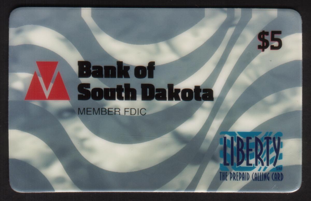 This is a Bank Card issued by Bank of South Dakota and Quest Group Internatl. It features the $5 denomination prominently on the right side of the card in a green rectangular box. The Bank of South Dakota logo is placed in the upper right corner, consisting of the bank’s name in blue text. The Quest Group Internatl branding is situated near the bottom right under the denomination, shown in a smaller font.