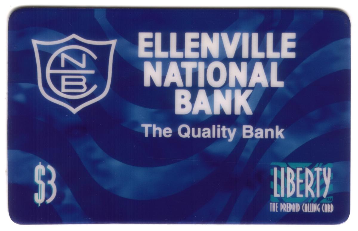 This collectible card features the logo and name of Ellenville National Bank, also identified as "The Quality Bank." Prominently displayed in the upper right corner is the bank's name along with a stylized emblem that appears to be part of their official branding. The card also includes text indicating it is part of the Quest Group International promotional material. The monetary value printed on the card is $3, signifying its function related to financial transactions or services connected to Ellenville National Bank.