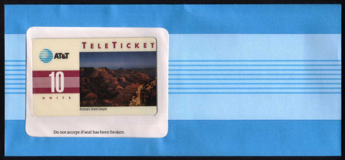 Overall, this AT&T Teleticket card combines functionality with artistic representation of one of the United States' most famous natural landmarks. It serves as both a prepaid phone card with a 10-unit value and a collectible item that captures the majestic beauty of Arizona’s Grand Canyon, reflecting its significance as a scenic and geological marvel.