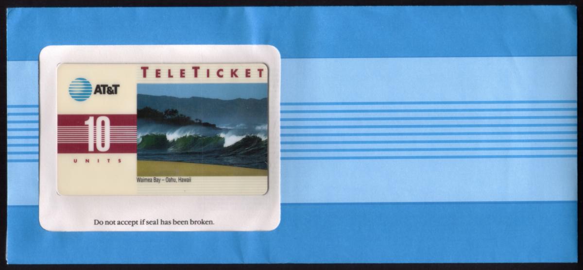 This is an AT&T Teleticket phone card with a value of 10 units. The card prominently features a scenic photograph of Waimea Bay, located on the island of Oahu, Hawaii. The image captures ocean waves breaking near the golden sandy shore, with a backdrop of lush green hills under a clear blue sky.