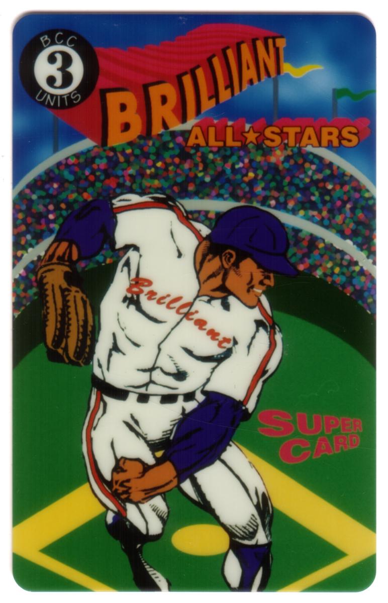 This collectible card presents a colorful cartoon illustration of a baseball pitcher in mid-throw, wearing a white uniform with red and blue trim. The player’s jersey prominently displays the word "Brilliant" in cursive red text across the chest. The pitcher's cap and undershirt are blue, along with a large brown glove on the left hand. The background features a stylized baseball stadium filled with a multicolored, densely packed crowd. Above the scene, the card title "BRILLIANT ALL STARS" appears in bold orange and yellow letters with a star replacing the letter "A" in "STARS." A small black circle in the top left corner contains the text "BCC UNITS 3."