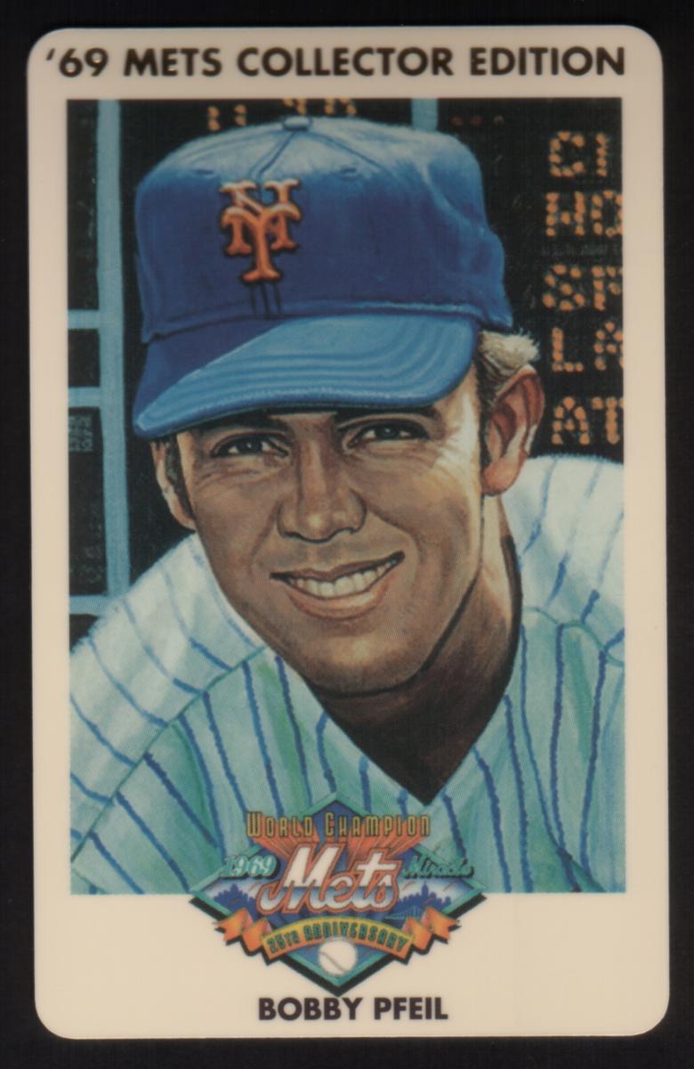 The card celebrates Major League Baseball history, specifically the 1969 championship season of the New York Mets, with a focus on player Bobby Pfeil. It is associated with Global Tel. Solutions, emphasizing its collectible nature tied to the sport and era.