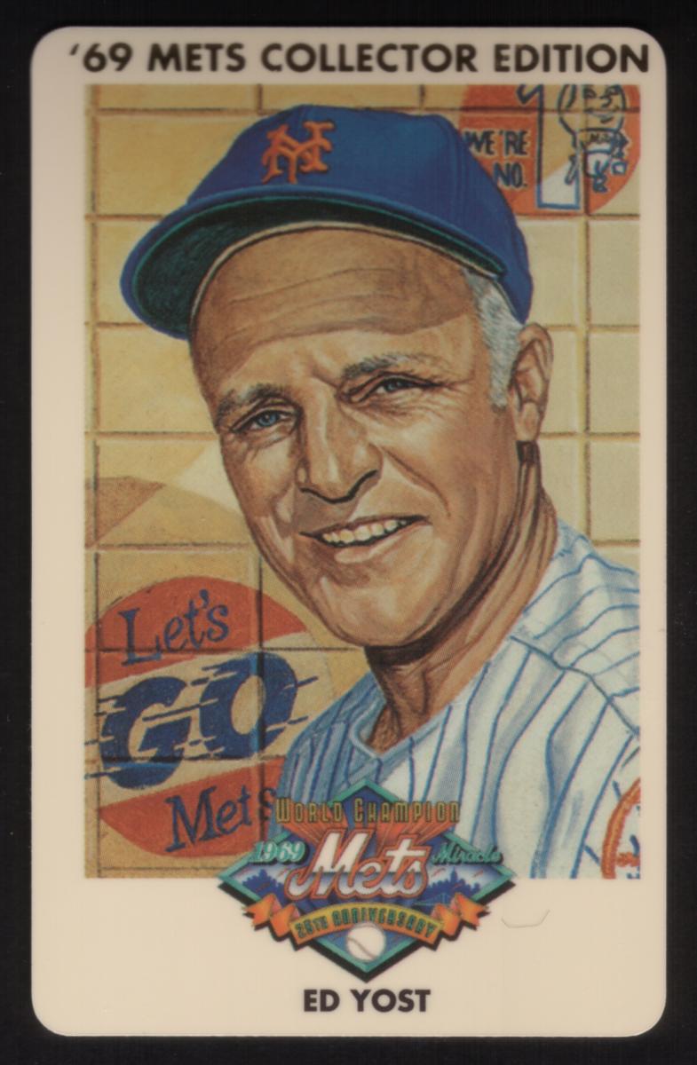 This collectible phone card prominently features Ed Yost, a baseball player associated with Major League Baseball and the 1969 Champion Miracle Mets team. The card commemorates the 25th anniversary of the 1969 Miracle Mets, a landmark in baseball history. Ed Yost is pictured in his Mets uniform, with the image capturing him in full action, holding a baseball bat. The design emphasizes the sports theme and Major League Baseball heritage, highlighting Yost’s contribution to the championship team.